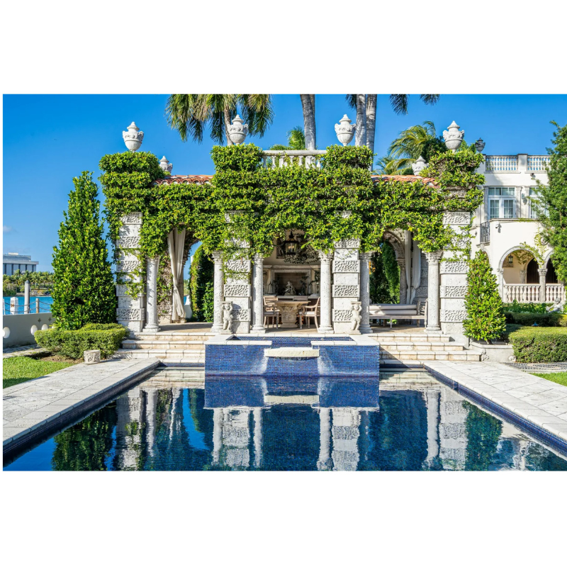 A 1930s Mediterranean Revival estate overlooking Biscayne Bay, it was originally built for a President of General Motors and then acquired in the late 1990s by the current owners Loren and J.R. Ridinger. The couple are the founders of Market America—a revolutionary product brokerage and internet marketing company—while Loren is also a well-known fashion, beauty, and business leader recognized by Vogue, Haute Living, and Forbes magazines. Using historical photos of the estate, the couple acquired period furniture, art, and decorative objects to help realize their vision of contemporary life in a historic setting.